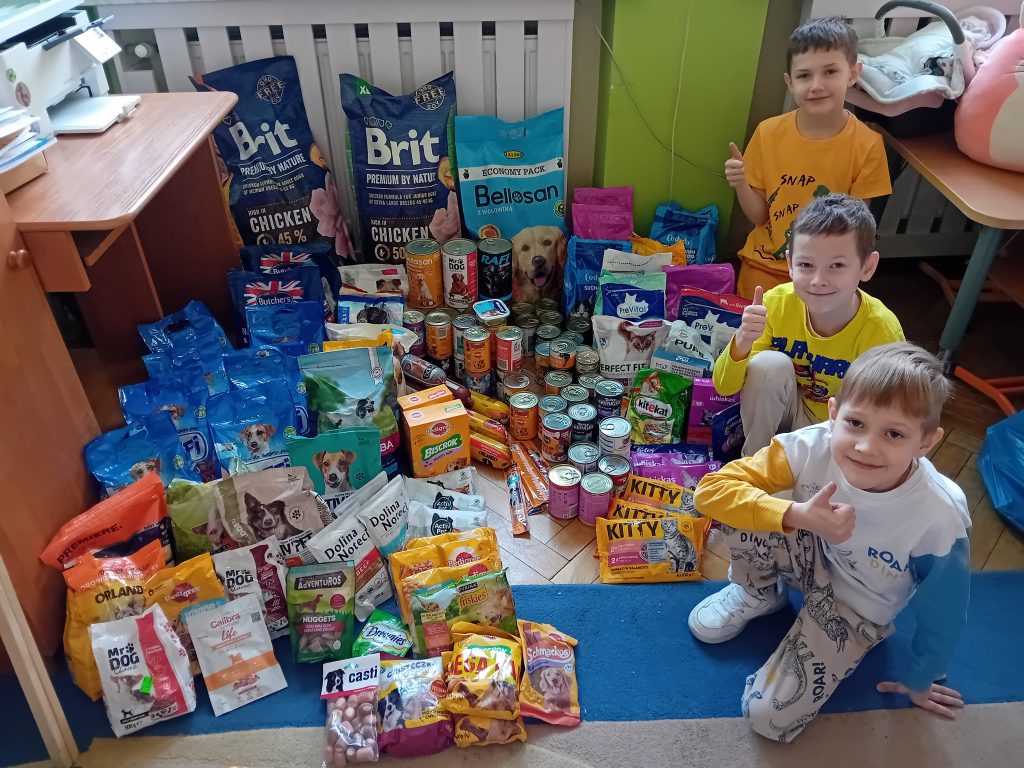 Mówi się, że „czystość serca człowieka można szybko zmierzyć po tym, jak traktuje zwierzęta". Dzięki wielkim sercom naszych uczniów, którzy wraz ze swoimi rodzicami wzięli udział w akcji zbierania darów dla psów i kotów będących pod opieką Fundacji "Zwierzaki z Mińska" organizowanej w naszej szkole  przez Szkolny Klub Nieobojętnych i Szkolny Klub Wolontariusza udało się zebrać prawie 154 kg karmy (mokrej i suchej karmy dla psów i kotów, a także różnych przysmaków). Oprócz tego w darach znalazło się również 14 misek, 7 kocyków, 4 legowiska, 36 sztuk różnych akcesoriów dla zwierząt  typu zabawki, gryzaki, ubranka, obroże, smycze, drapaki dla kotów itp.