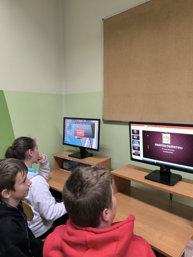24 października na zajęciach komputerowych uczniowie  przygotowali prezentacje multimedialne propagujące bezpieczne zachowania pieszego i rowerzysty w ruchu drogowym.