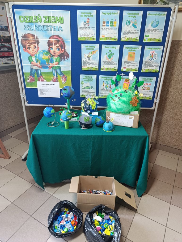 22 kwietnia obchodzony jest Światowy Dzień Ziemi, z tej okazji w naszej szkole został zorganizowany konkurs ekologiczny Model Ziemi 3D pod hasłem ZAINWESTUJ W NASZĄ PLANETĘ. Prace konkursowe zostały wyeksponowane w holu szkoły. Odbyła się też zbiórka zużytych baterii oraz plastikowych korków, którą przeprowadziły uczennice z klasy 8b oraz 7c. Bardzo dziękujemy za włączenie się w akcję, która miała na celu uświadomienie wszystkim jak ważne jest życie w zgodzie z naturą.