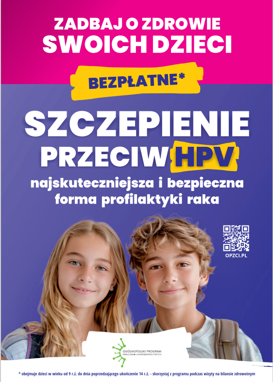 Zapraszamy do zapoznania się z informacjami na temat bezpłatnych szczepień przeciwko HPV. Szczepionka jest dostępna bezpłatnie dla wszystkich dzieci od 9 do 18 roku życia. Szczepienia są całkowicie dobrowolne, a decyzje w ich sprawie podejmują rodzice lub opiekunowie po konsultacji z lekarzem.