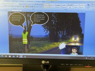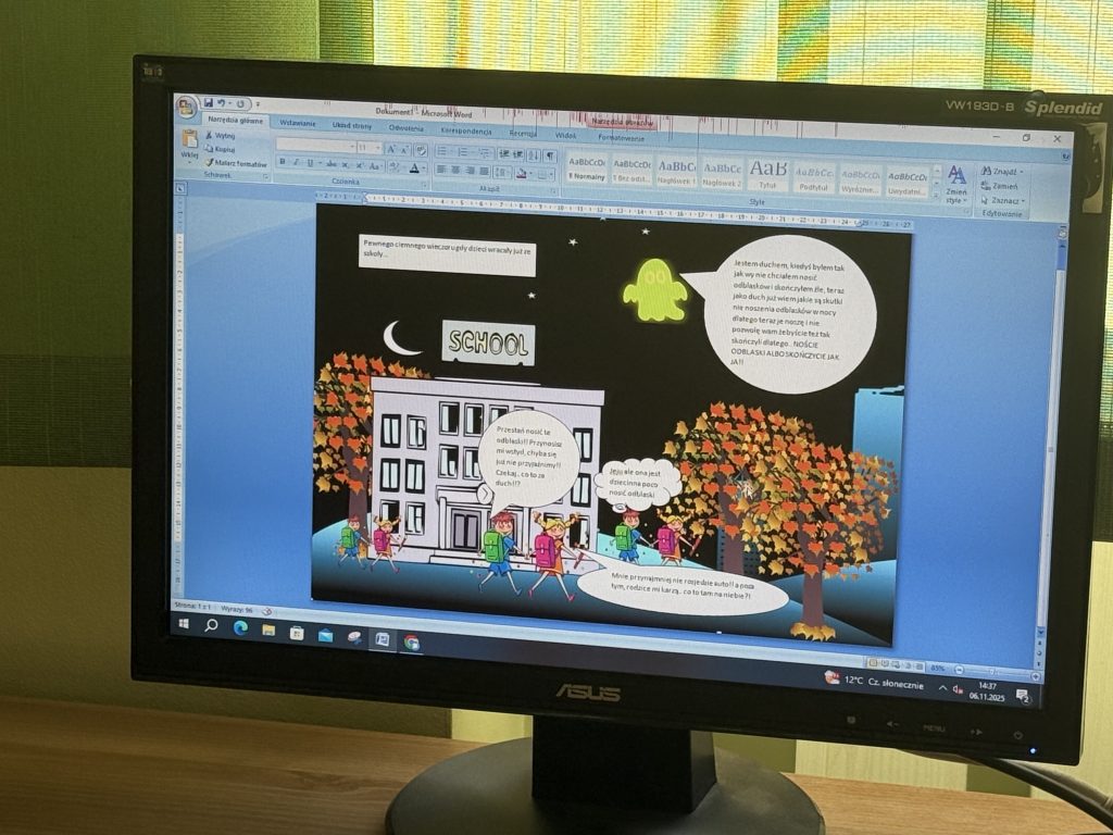Dnia 6 listopada w ramach akcji „Odblaskowa szkoła 2025” uczniowie na zajęciach komputerowych wykonali w edytorze tekstu historyjkę obrazkową propagującą bezpieczne poruszanie się po drogach. Była to również doskonała okazja do utrwalenia umiejętności korzystania z narzędzi edytora tekstu.