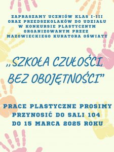Prace należy dostarczyć do nauczyciela plastyki p. Marzeny Kozak (kl. 4-8) lub do swojego wychowawcy (kl. 0-3).