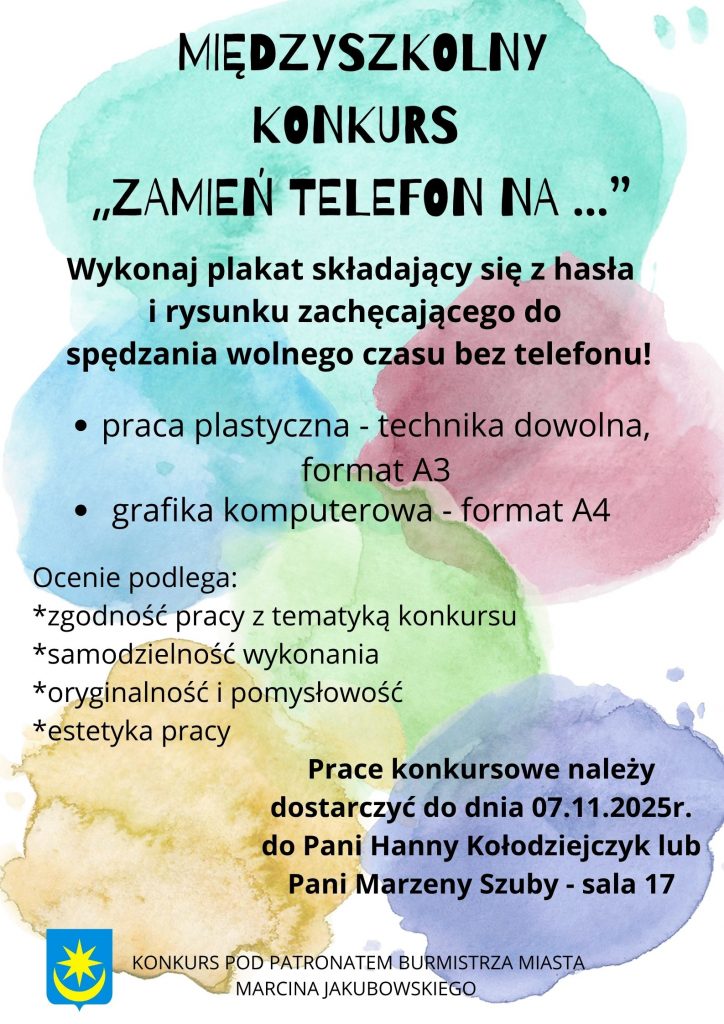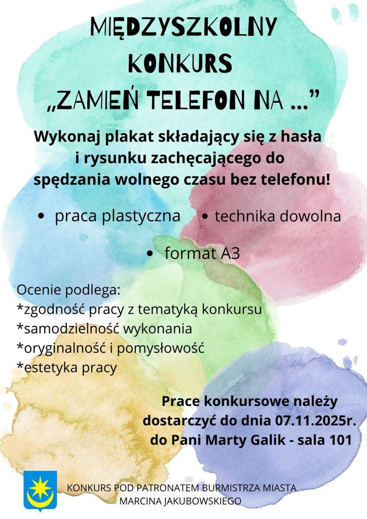 17 listopada 2025r. nastąpiło rozstrzygnięcie międzyszkolnego konkursu plastycznego dla klas I – VIII szkół z naszego miasta pod hasłem „Zamień telefon na …”. Celem zmagań było promowanie aktywnych form spędzania wolnego czasu bez korzystania z telefonu. Uczestnicy wykazali się pomysłowością i kreatywnością w prezentacji zagadnienia, stosując różnorodne techniki plastyczne. Wykonane prace stały się ciekawą propozycją na spędzanie wolnego czasu.