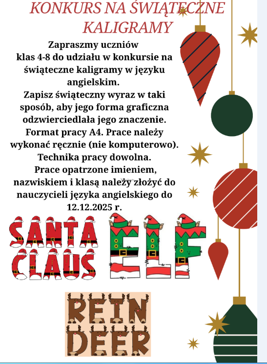 Przed świętami uczniowie klas 4-8 licznie wzięli udział w konkursie z języka angielskiego "Świąteczne Kaligramy". Do organizatorów wpłynęło około 50 pięknie wykonanych, ciekawych prac. Uczestnicy wykazali się niezwykle kreatywnymi pomysłami oraz zdolnościami plastycznymi.