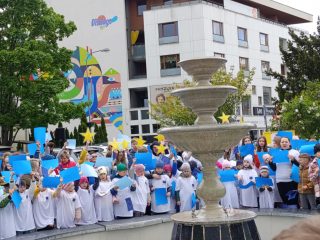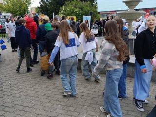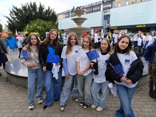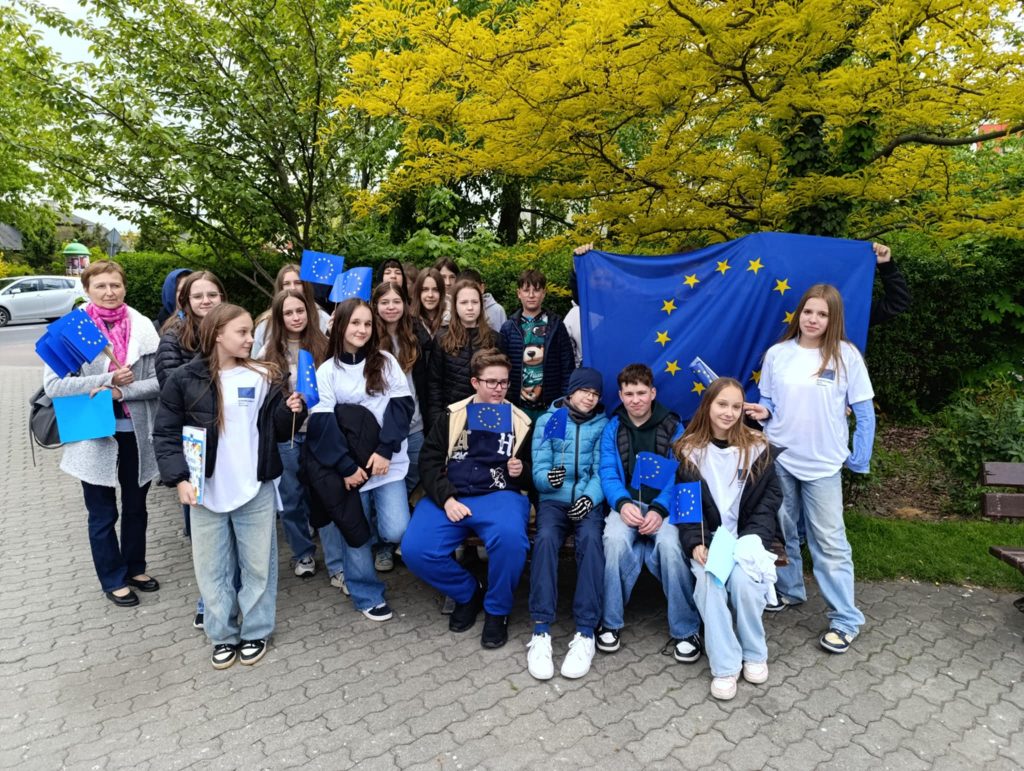 W piątek, 9 maja 2025 roku, uczniowie naszej szkoły wzięli udział w radosnych obchodach Dnia Europy, zorganizowanych przez punkt #Europe Direct w Mińsku Mazowieckim. Wydarzenie miało formę happeningu i odbyło się na miejskim skwerze przy fontannie, który na ten dzień stał się centrum europejskich wartości i wspólnoty.