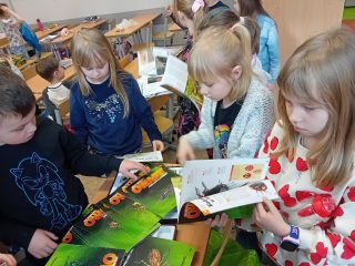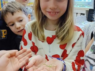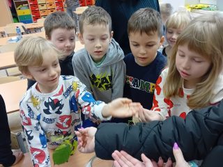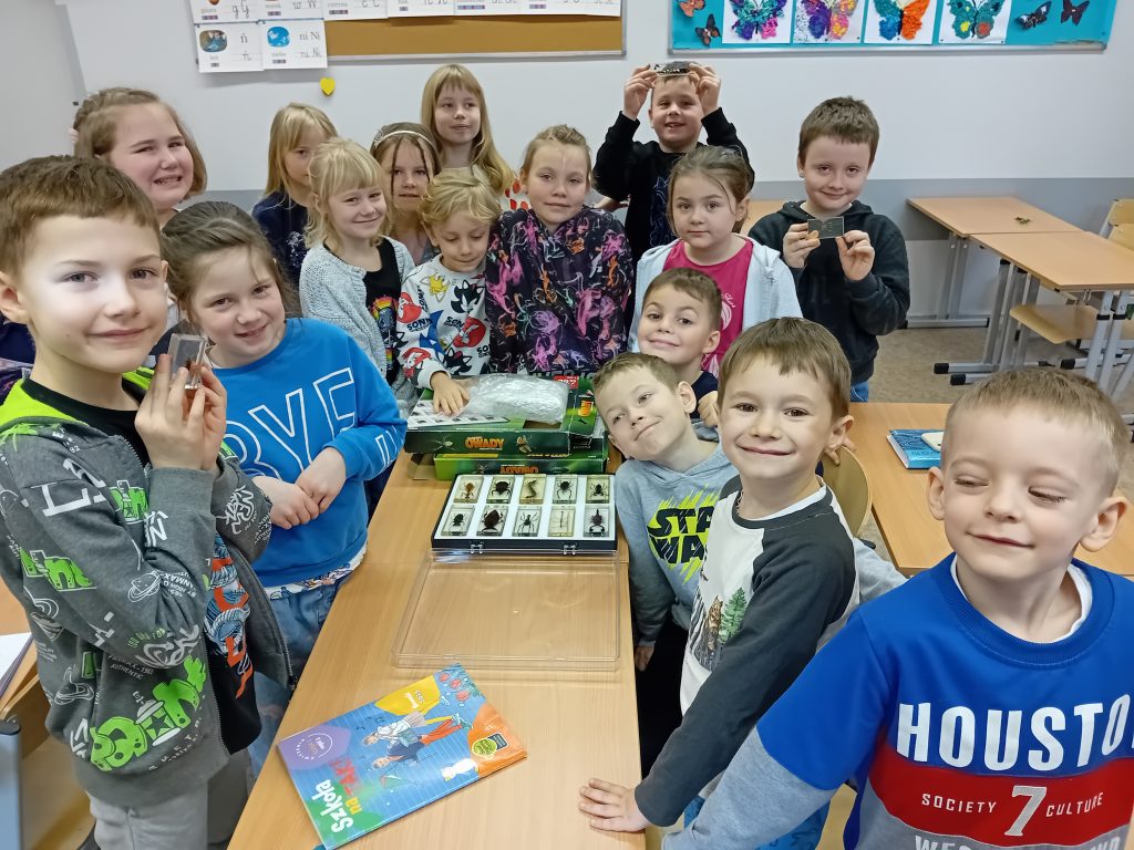 Do klasy 1B zawitali nietypowi goście – owady, pajęczaki i przeróżne robaki. Dzieci przyniosły bardzo ciekawe materiały i przedmioty związane ze światem owadów i nie tylko. Były to ciekawe książki, czasopisma, eksponaty, zabawki, a także kolekcja najrzadszych gatunków owadów, pajęczaków i innych stawonogów zatopionych w przezroczystej żywicy syntetycznej, która utrwaliła je tak samo skutecznie jak te sprzed tysięcy lat, które odkrywamy w kawałkach bursztynu. Dzieci poznały cykl życia motyli, owady pożyteczne i te, które są szkodnikami. Dowiedziały się również, jak wygląda życie rohatyńca borneańskiego żyjącego w Australii, jaka jest różnica między naszą pszczołą a pszczołą miesierkowatą z Indii, jak wygląda kruszczyca japońska i jakie ma zwyczaje balijski żuk klejnot, czy mrówka olbrzymia. Jednak największym zainteresowaniem cieszył się żywy okaz patyczaka, którego zaprezentował nam Bartek wraz ze swoją mamą. Dzieci mogły obejrzeć go z bliska, dotknąć i wysłuchać ciekawostek na temat jego życia. To było wielkie przeżycie!