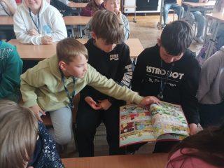 16 maja, w czasie lekcji języka polskiego, uczniów klasy 4a i 4b odwiedził pan Wojciech „Cichy” Cichoń – mińszczanin, autor serii komiksów o Grzegorzu Siekyrze, pierwszym znanym z imienia i przezwiska mieszkańcu Mińska Mazowieckiego. Pan Wojciech opowiedział uczniom o dziejach Mińska Mazowieckiego, genealogii, historii komiksu, a przede wszystkim o warsztacie pracy rysownika. Gość zaprezentował uczniom kolejne etapy powstawania historyjki komiksowej, od pomysłu do gotowej publikacji.