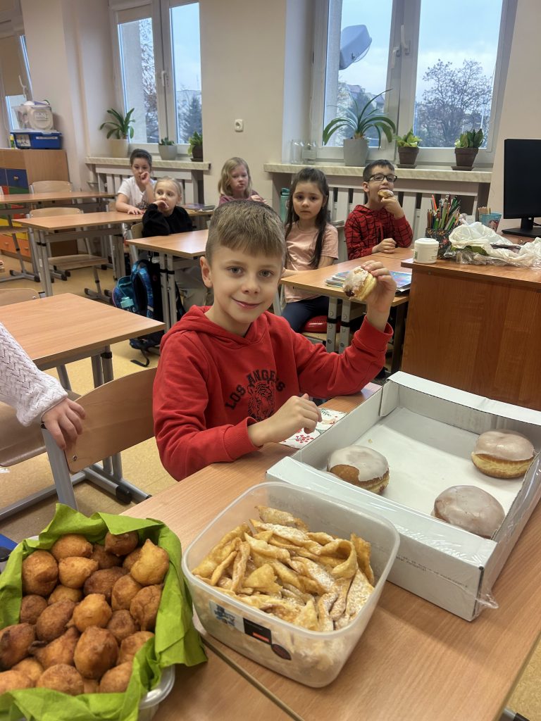 Tłusty czwartek to doskonała okazja, aby skosztować przepysznych pączków i faworków. Zgodnie z tradycją każdy z nas powinien tego dnia zjeść przynajmniej jednego, słodkiego pączka. Tak było i u nas, w klasie Id. Mieliśmy okazję zasmakować pysznych lukrowanych pączków oraz faworków, które przygotowali dla nas rodzice! To był świetny dzień!