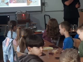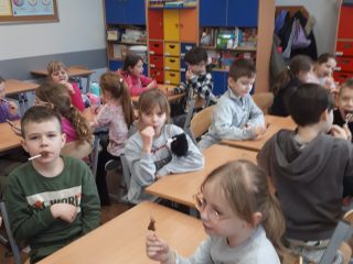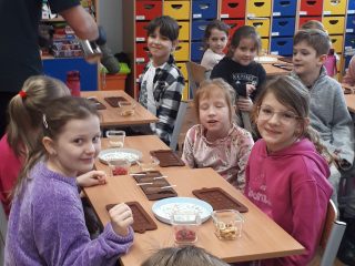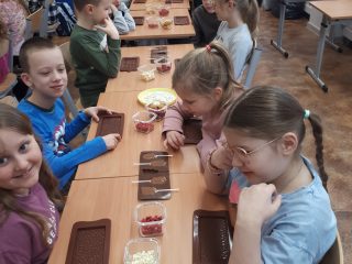4 marca 2025 r. klasy 2 b brała udział w warsztatach dekorowania czekolady prowadzonych przez Akademię Czekolady dla Dzieci. W pierwszej części warsztatów dzieci miały okazję poznać etapy produkcji czekolady, obejrzeć owoce i nasiona kakaowca, poznać miejsca gdzie rośnie kakaowiec. Następnie uczniowie dokonali degustacji czekolady- zjedli własnoręcznie zrobione i ozdobione czekoladowe lizaki. Po takim “małym poczęstunku” mogły już zabrać się do twórczej pracy. Otrzymały formy, które wypełnione były płynną czekoladą. Każdy uczeń stworzył własnoręcznie swoją wymarzoną tabliczkę czekolady, którą ozdobił zdrowymi, pysznymi owocami liofilizowanym. Uczniowie pracowali z wielkim zaangażowaniem. Gdy czekolada zastygła, samodzielnie zapakowali tabliczki do ozdobnej torebki i zabrali do domu. To był miło i twórczo spędzony czas.