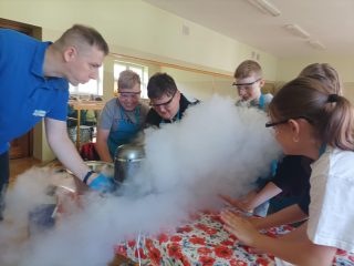 12 czerwca uczniowie klas 4a, 4b, 4c, 4d, 5c, 6c, 7c uczestniczyli w interesujących warsztatach kuchni molekularnej przeprowadzone przez Bajkową Fabrykę 3d. Wcielili się oni w rolę chemików i kucharzy, wykonując pod okiem prowadzącego doświadczenia z użyciem suchego lodu i ciekłego azotu. Ważnym elementem zajęć była degustacja, podczas której wszyscy spróbowali własnoręcznie stworzonych zdrowych, sorbetowych lodów oraz dymiących, smoczych chrupek. Ogromne zainteresowanie wzbudziły eksperymenty chemiczne, które okazały się nie tylko świetną zabawą, ale także doskonałym‌ sposobem na rozwijanie ciekawości i kreatywności uczniów. Warsztaty sprawiły uczestnikom dużo radości i były okazją do zapoznania się z nowoczesną techniką kulinarną.
