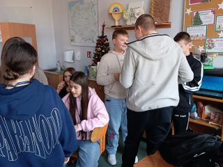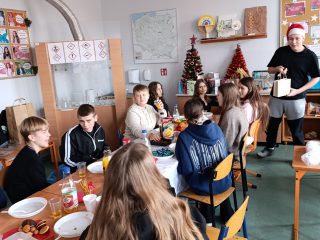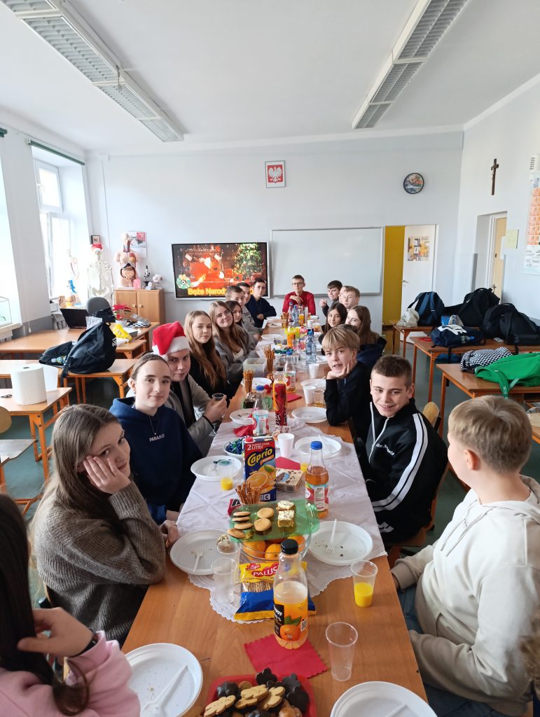 19.12. 2025 r. odbyła się się wigilia klasowa w 8b. Wigilijny stół był odświętnie nakryty białym obrusem oraz zastawiony słodkościami. Oczywiście nie mogło zabraknąć barszczu z pasztecikami. W świątecznym nastroju uczniowie wspólnie z wychowawczynią klasy śpiewali kolędy, tradycyjnie podzielili się opłatkiem składając sobie świąteczne życzenia. Miłym akcentem były prezenty znalezione pod choinką i rozdane przez „klasowego Mikołaja”.